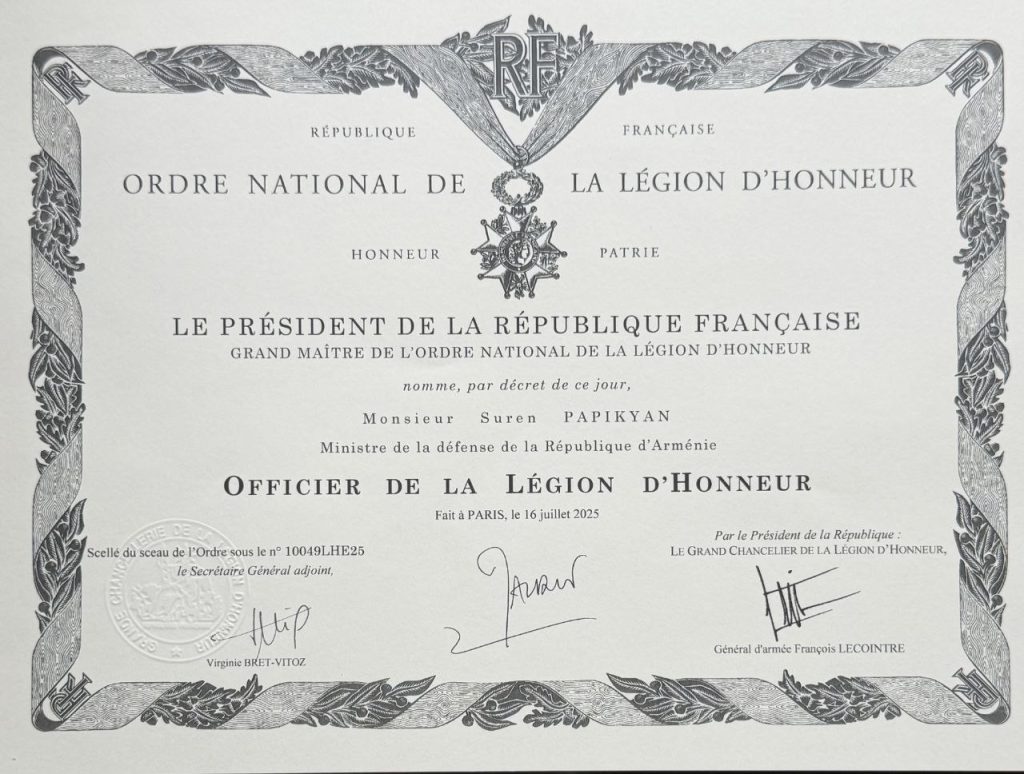 Մակրոնի հրամանագրով Պապիկյանին շնորհվել է Ֆրանսիայի «Պատվո լեգեոն» շքանշանը