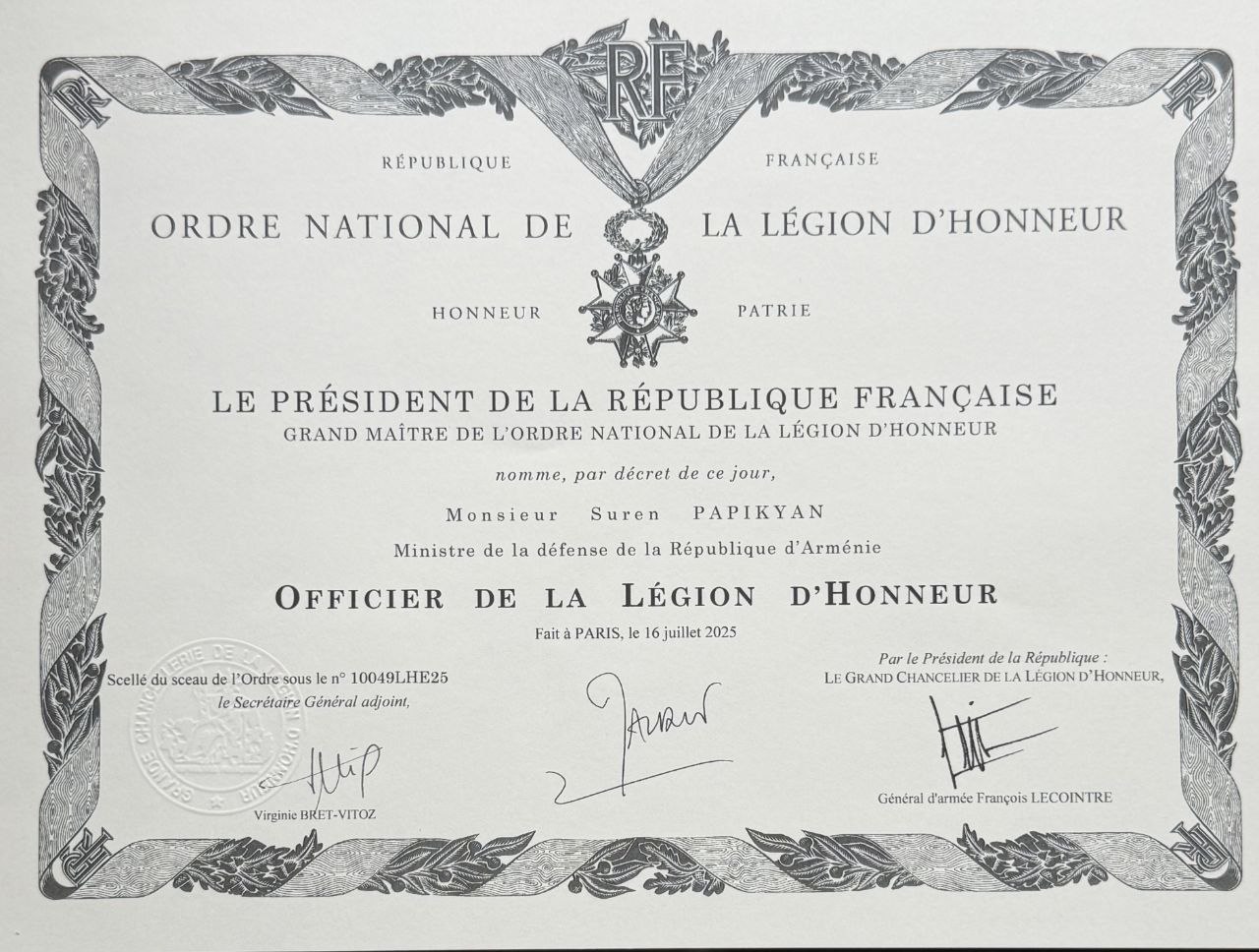 Նախօրեին հայտնի դարձավ, որ Ֆրանսիայի նախագահ Էմանուել Մակրոնի հրամանագրով ՀՀ պաշտպանության նախարար Սուրեն Պապիկյանը պարգևատրվել է Ֆրանսիայի բարձրագույն պետական պարգևով՝ «Պատվո լեգեոն» շքանշանով՝ ստանալով «սպա» (Officier) աստիճանը։