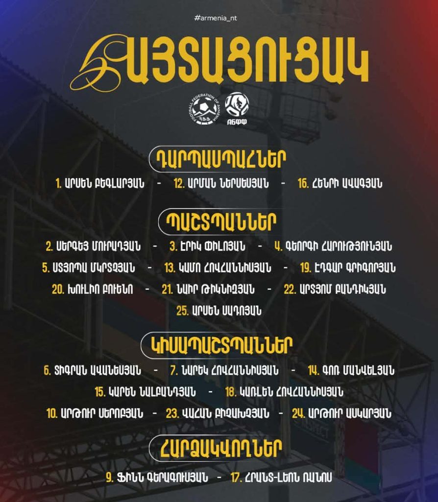 ՀՖՖ-ն հրապարակել է Հայաստանի ազգային հավաքականի հայտացուցակը Բելառուսի հավաքականի դեմ ընկերական խաղում։