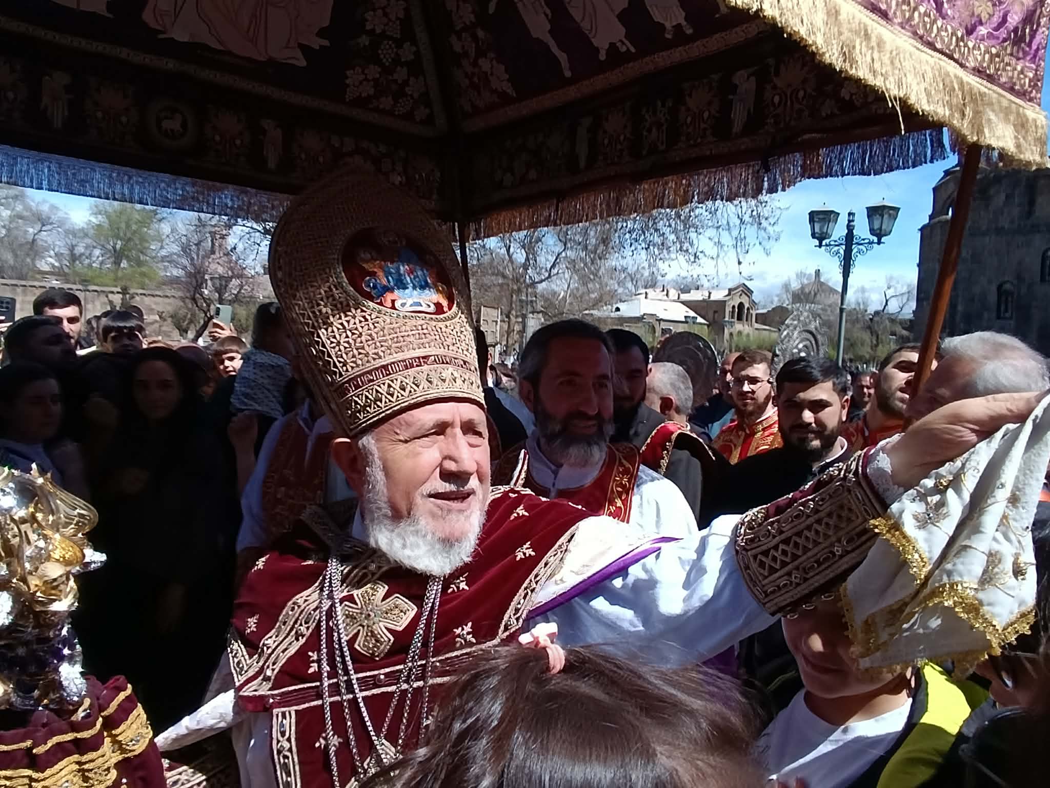 Մայր Աթոռի բակում կաթողիկոսը՝ եպիսկոպոսների, արքեպիսկոպոսների և մյուս հոգևորականների ուղեկցությամբ Մայր Տաճարից դուրս եկավ և հավատավոր ժողովրդին օրհնելով շարժվեց դեպի Վեհարան։