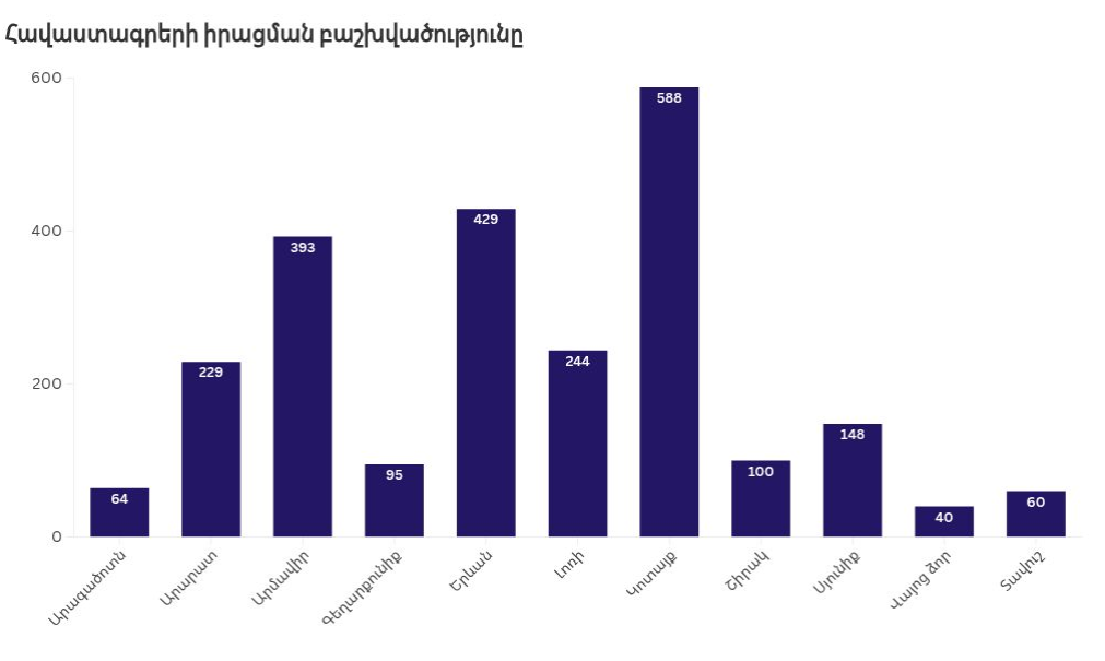 Ամենաշատ հավաստագրերը իրացվել են Կոտայքի մարզում՝ 588 դեպք, որին հաջորդում է Երևանը՝ 429, և Արմավիրի մարզը՝ 393։ Ամենաքիչը գրանցվել է Վայոց ձորի մարզում՝ 40 դեպք, ինչպես նաև համեմատաբար քիչ են Տավուշի մարզում՝ 60 և Արագածոտնի մարզում՝ 64։