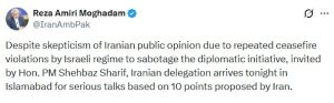 Գրառման մեջ  նա նշել էր, որ  իրանական պատվիրակությունը «այսօր երեկոյան կժամանի Իսլամաբադ՝ Իրանի կողմից առաջարկված 10 կետերի շուրջ լուրջ բանակցություններ վարելու համար»։  ԱՄՆ-ն և Իրանը հակասական կարծիքներ ունեն այդ կետերի վերաբերյալ։