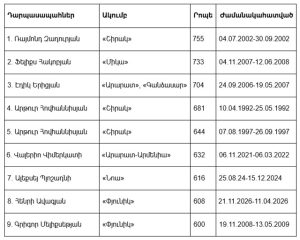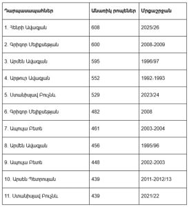 «Փյունիկը» ներկայացրել է ակումբի՝ Հայաստանի առաջնություններում դարպասն անընդմեջ անառիկ պահած րոպեների քանակով դարպասապահների լավագույն տասնյակը: