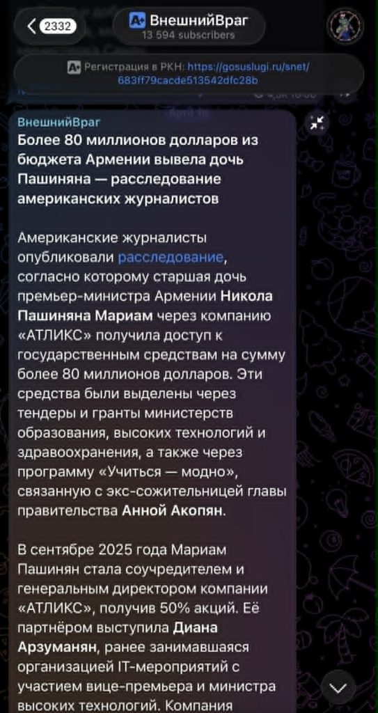 Սոցիալական ցանցերում (X, Facebook, Telegram) տեղեկություն է տարածվում է, թե ՀՀ վարչապետ Նիկոլ Փաշինյանի դուստր Մարիամ Փաշինյանն իր «ԱԹԼԻՔՍ» ընկերության միջոցով ներգրավված է կոռուպցիոն սխեմաների, անօրինական բիզնես գործունեության մեջ և պետբյուջեից ավելի քան 80 միլիոն դոլար է յուրացրել։ Factor TV-ն ուսումնասիրել է VT Foreign Policy կոչվող կայքում հրապարակված հոդվածը, դրանում առկա պնդումները, համացանցում դրանց տարածման մոտիվները։