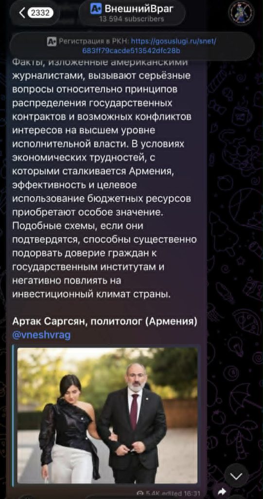 Հրապարակումը տարածողների թվում կան ինչպես իրական, այնպես էլ կեղծ օգտահաշիվներով էջեր։ Այստեղ ևս նյութը ներկայացվում էր որպես «ամերիկացի լրագրողների հետաքննություն», մինչդեռ նման ձևակերպումը շրջանառվում էր ռուսալեզու տելեգրամյան ալիքներում։