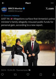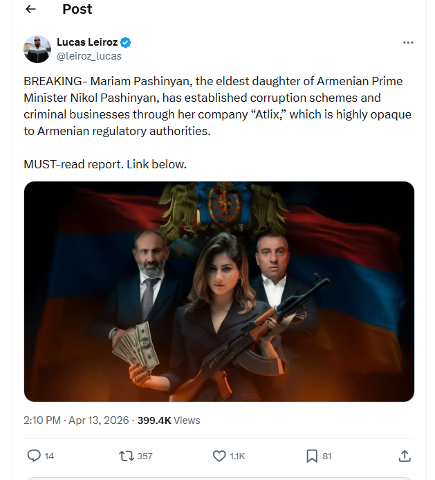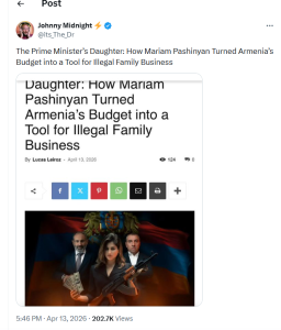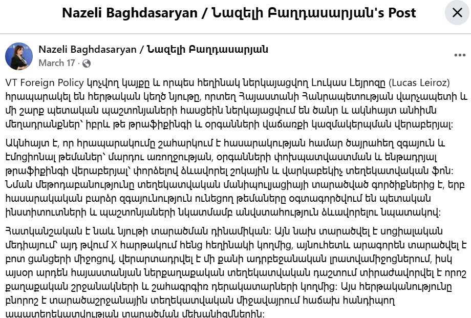 Ապրիլի 13-ին VT Foreign Policy-ի կայքում հրապարակված հոդվածը հեղինակը տարածել է նաև X-ում, որտեղ շուրջ 399 հազար դիտում, 1100 հավանում ունի, իսկ 357 անձ կիսվել է դրանով։