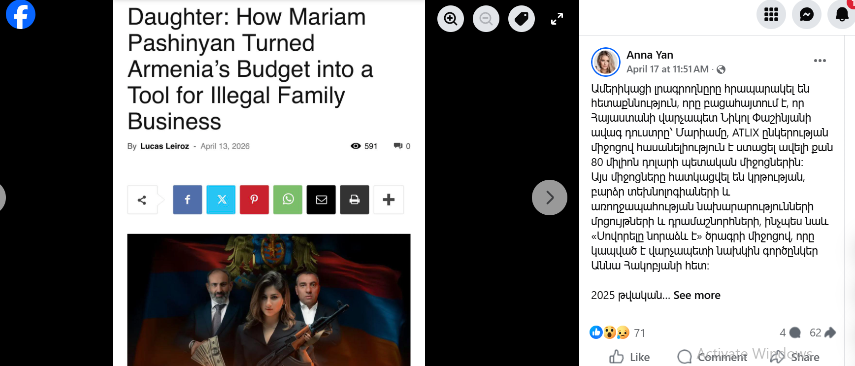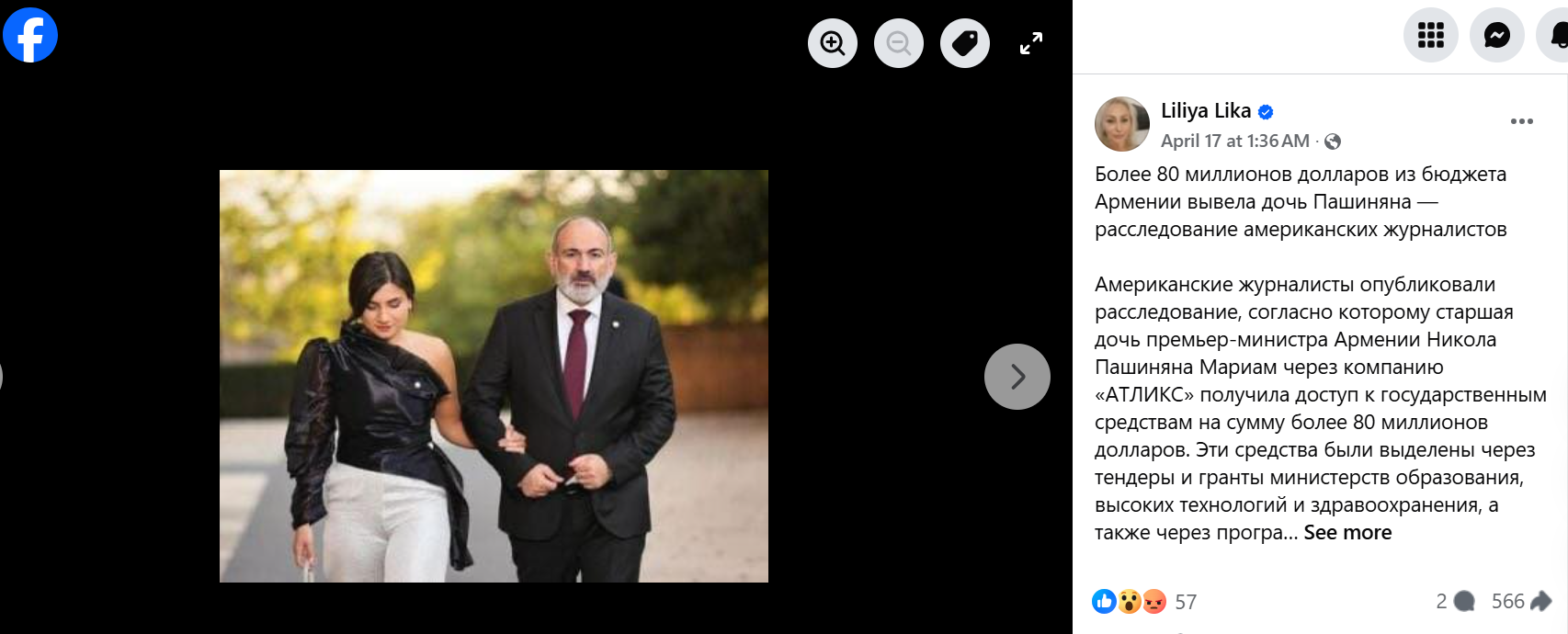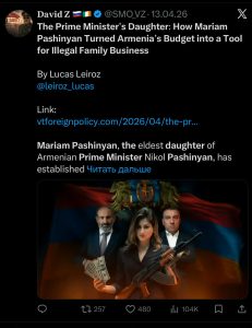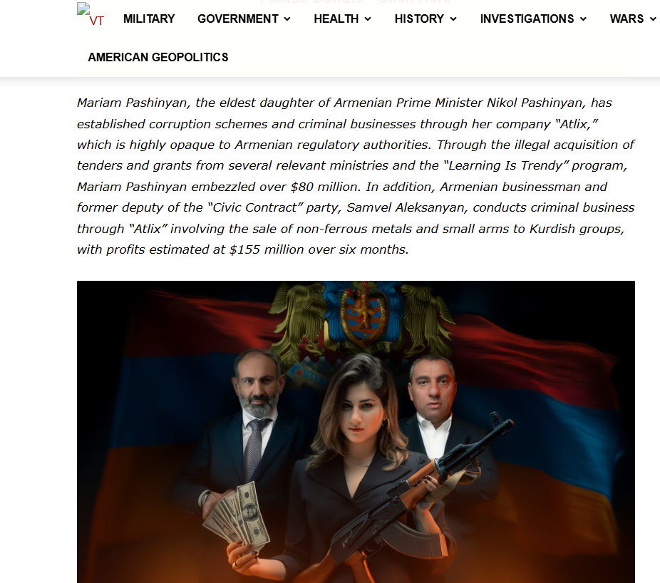 «Վարչապետի դուստրը. Ինչպես Մարիամ Փաշինյանը Հայաստանի բյուջեն վերածեց անօրինական ընտանեկան բիզնեսի գործիքի» վերատառությամբ հոդվածը VT Foreign Policy-ին հրապարակել է ապրիլի 13-ին։