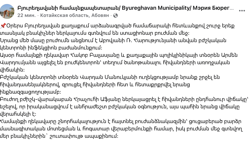 Բյուրեղավանում համաճարակի հետևանքով շուրջ երեք տասնյակ բնակիչներ բուժվում են ստացիոնարում. նրանց վիճակը վերահսկելի է