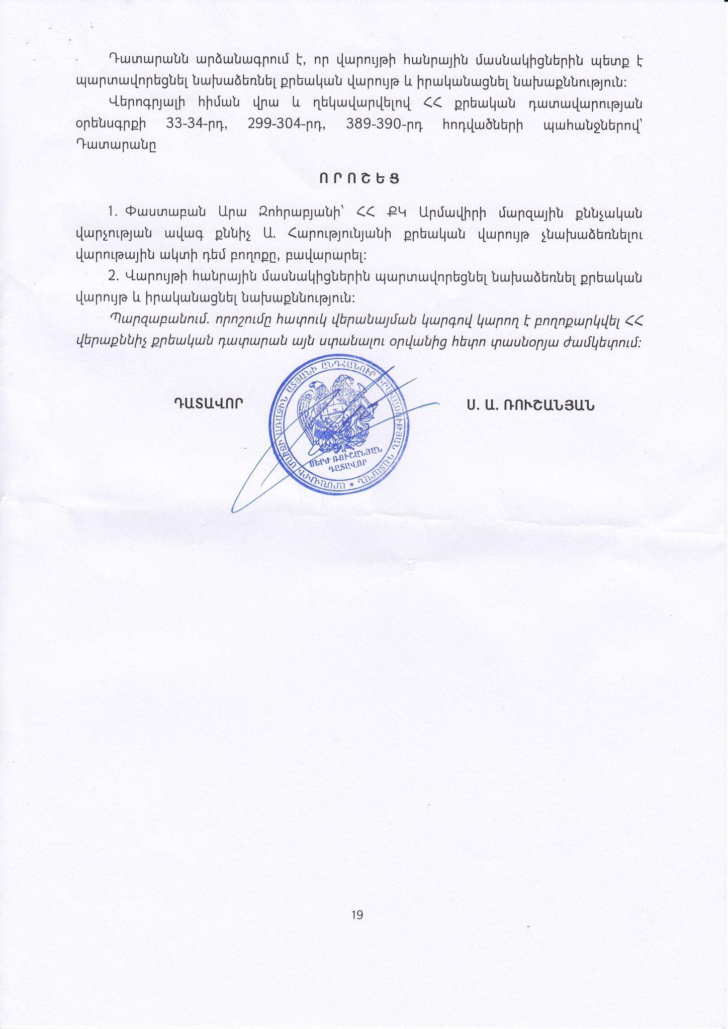 Դատախազությունը մերժել էր քննչական մարմնի այդ ապօրինի դիրքորոշման դեմ ներկայացված բողոքը: Արմավիրի մարզի առաջին ատյանի ընդհանուր իրավասության դատարանը (դատավոր Սերժ Ռուշանյան) որոշել է բավարարել բողոքը՝ վարույթի հանրային մասնակիցներին ՊԱՐՏԱՎՈՐԵՑՆԵԼՈՎ ՆԱԽԱՁԵՌՆԵԼ ՔՐԵԱԿԱՆ ՎԱՐՈՒՅԹ և իրականացնել նախաքննություն: Դատարանն արձանագրել է, որ որ վարույթ չնախաձեռնելու հետևանքով ենթադրյալ հանցանքի կապակցությամբ չեն ձեռնարկվել ողջամիտ քայլեր, որոնք օբյեկտիվ դիտորդին համոզիչ կերպով հնարավորություն կընձեռեին լիարժեք պատկերացում կազմել դեպքի իրական հանգամանքների վերաբերյալ, հետևաբար՝ վարույթի հանրային մասնակիցների կողմից կայացված վարութային ակտերը հիմնավոր չեն: