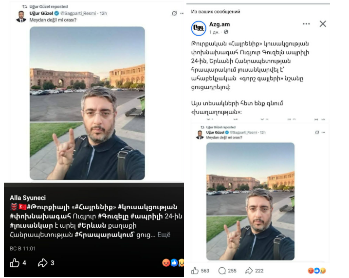 Ապրիլի 24-ից հայկական մեդիատիրույթում սկսել է տարածվել թուրք օգտատիրոջ կողմից հրապարակված մի լուսանկար, որտեղ նա ցույց է տալիս «Գորշ գայլեր» թուրքական ծայրահեղ ազգայնական շարժման տարբերանշանը։