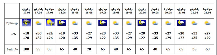 Օգոստոսի 17-ին՝ գիշերը և երեկոյան ժամերին, սպասվում է անձրև և ամպրոպ, ամպրոպի ժամանակ սպասվում է քամու ուժգնացում՝ 20-25 մ/վ: Օգոստոսի 18-21-ը սպասվում է առանց տեղումների եղանակ: