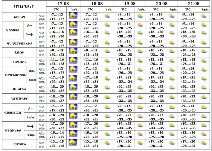 Օգոստոսի 17-ին՝ գիշերը և երեկոյան ժամերին, շրջանների մեծ մասում սպասվում է անձրև և ամպրոպ, ամպրոպի ժամանակ սպասվում է քամու ուժգնացում՝ 20-25 մ/վ, առանձին վայրերում հնարավոր է կարկուտ: Օգոստոսի 18-21-ը սպասվում է առանց տեղումների եղանակ: