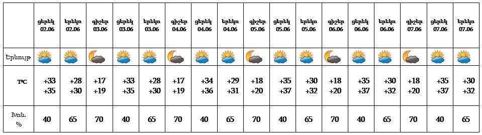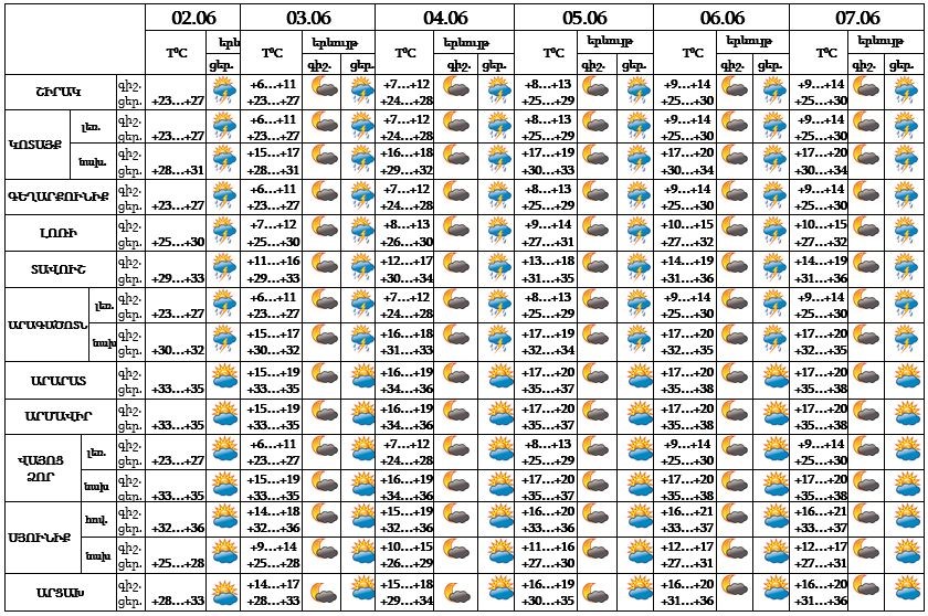 Հունիսի 2-7-ն առանձին շրջաններում կեսօրից հետո սպասվում է կարճատև անձրև և ամպրոպ: Քամին՝ հարավ-արևելյան՝ 3-8 մ/վ: