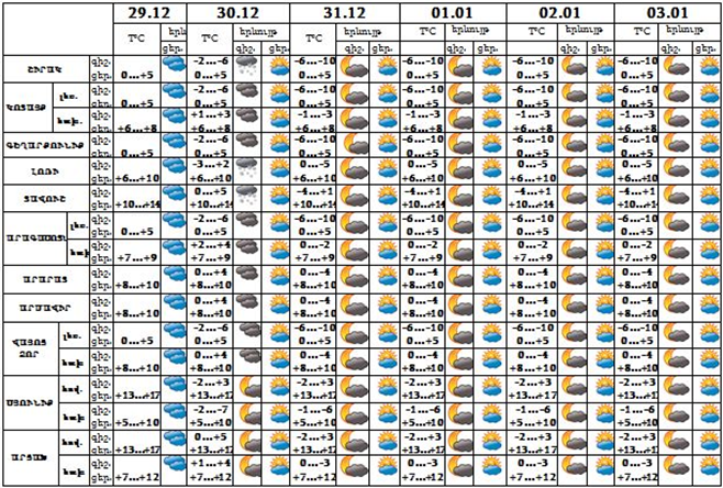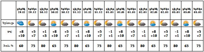 Հանրապետության տարածքում դեկտեմբերի 29-ի և 30-ի ցերեկը, 31-ին և հունվարի 1-3-ը սպասվում է առանց տեղումների եղանակ: Դեկտեմբերի 30-ի գիշերն առանձին հյուսիսային շրջաններում սպասվում են տեղումներ: