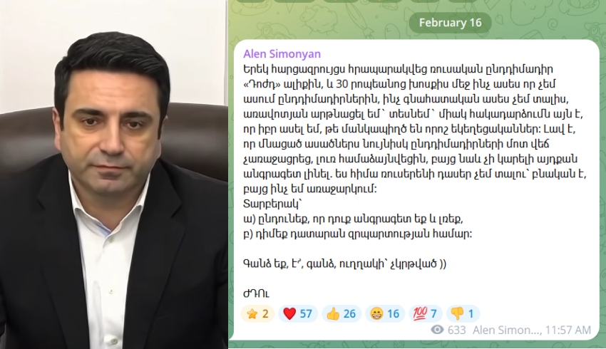 «Կամ ընդունեք անգրագիտությունը, կամ դիմեք դատարան»․ Ալեն Սիմոնյանը՝ Дождь-ին տված հարցազրույցում հոգևորականների վերաբերյալ հայտարարության մասին