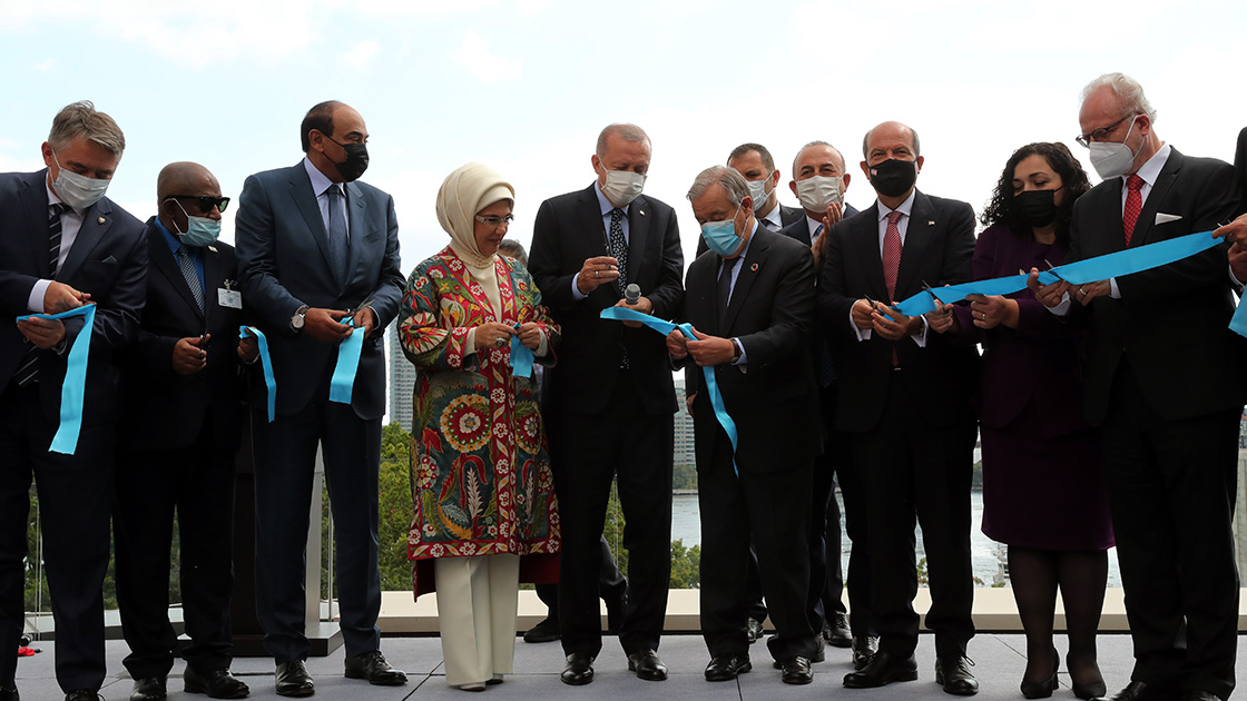 Türkiye Cumhurbaşkanı Recep Tayyip Erdoğan ve eşi Emine Erdoğan, Türkiye’nin Birleşmiş Milletler Daimi Temsilciliği ile New York Başkonsolosluğunun yer alacağı yeni Türkevi binasının açılışına katıldı. Cumhurbaşkanı Erdoğan, açılış kurdelesini Kuzey Kıbrıs Türk Cumhuriyeti (KKTC) Cumhurbaşkanı Ersin Tatar (sağ 3), BM Genel Sekreteri Antonio Guterres (sağ 4) ve diğer katılımcılarla birlikte kesti. ( Mustafa Kamacı – Anadolu Ajansı )
