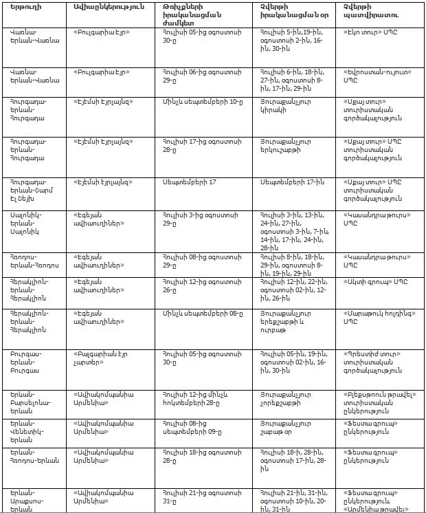 ՀՀ կառավարությանն առընթեր քաղաքացիական ավիացիայի գլխավոր վարչությունը մի շարք ավիաընկերությունների ամռան ընթացքում զբոսաշրջային ուղղություններով ոչ կանոնավոր չվերթներ իրականացնելու թույտվություն է տրամադրել: