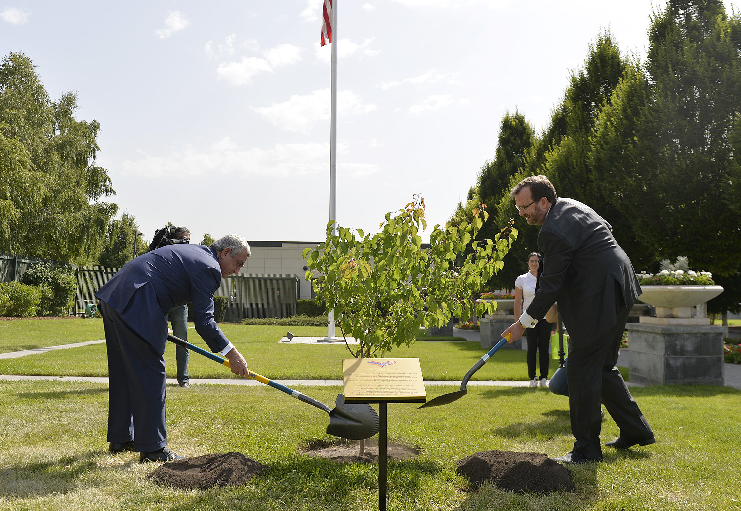 Նախագահ Սարգսյանը և դեսպան Միլսը Միացյալ Նահանգների դեսպանության բակում նախ ծիրանենի են տնկել: Միացյալ Նահանգների դեսպանը շնորհակալություն է հայտնել ՀՀ Նախագահին այցելության և շնորհավորանքի համար` նշելով, որ ուրախ ու հպարտ է Հանրապետության Նախագահի հետ միասին տնկել գեղեցիկ ծիրանենին ԱՄՆ դեսպանատանը՝ ի նշանավորումն ԱՄՆ անկախության 241-րդ տարեդարձի և հայ-ամերիկյան դիվանագիտական հարաբերությունների հաստատման 25-ամյա հոբելյանի: «Միացյալ Նահանգները բարձր է գնահատում Հայաստանի հետ իր երկարամյա գործընկերությունն ու անկեղծ բարեկամությունը, և վերջին 25 տարիների ընթացքում մենք միասին կերտել ենք ամուր կապեր դիվանագիտության, զարգացման, ռազմական, առևտրային տիրույթներում ու մեր ժողովուրդների միջև: Մեր հայացքը հառելով դեպի ապագա՝ հուսով ենք, որ մեր հարաբերություններն առավել կամրապնդվեն, և մենք կկարողանանք առավել խորացնել հատկապես մեր առևտրային և ներդրումային կապերը՝ ի շահ մեր երկու երկրների»,-ասել է դեսպան Միլսը: