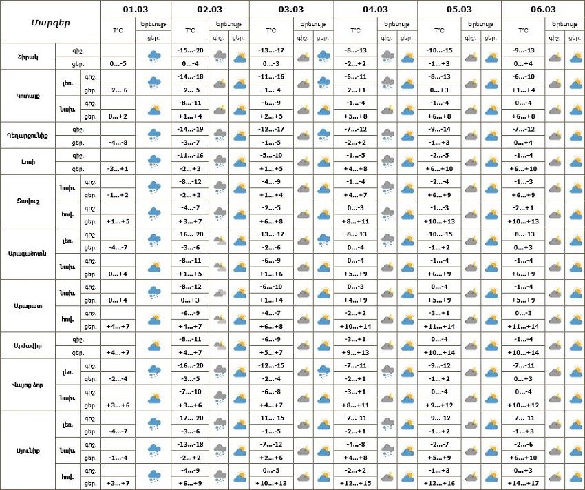 Օդի ջերմաստիճանը մարտի 3-6-ը և՛ գիշերը, և՛ ցերեկն աստիճանաբար կբարձրանա 4-8 աստիճանով։