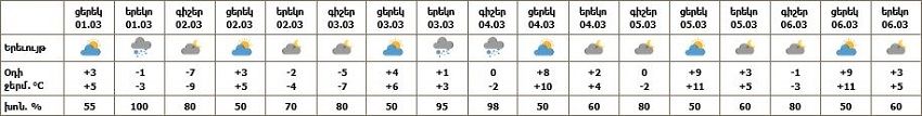 Երևան քաղաքում մարտի 3-ի երեկոյան, 4-ի գիշերը բարձրադիր հատվածներում հնարավոր է թույլ ձյուն։ Մարտի 2-ին, 3-ի գիշերը, 4-ի ցերեկը, 5-6-ը սպասվում է առանց տեղումների եղանակ։