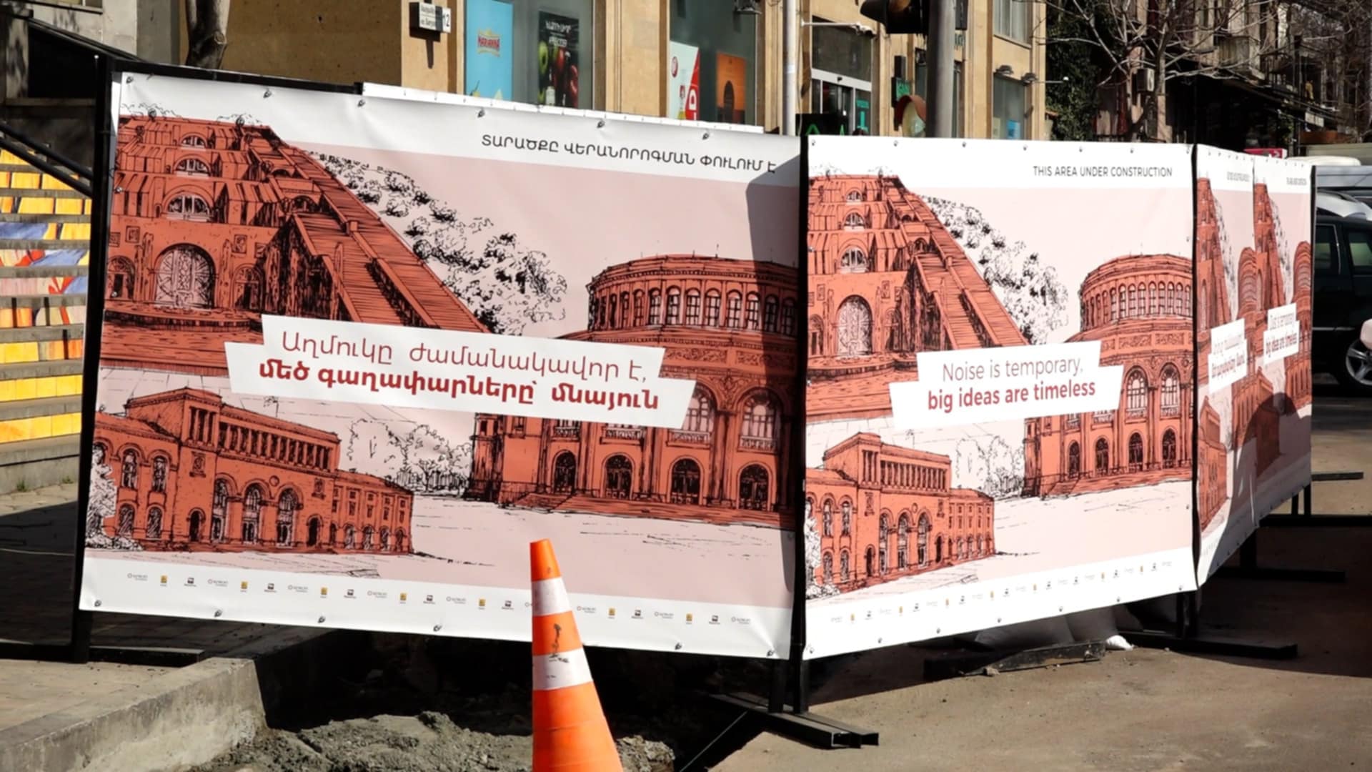 Երևանի Սարյանի փողոցի գլխավոր աստիճանների հարակից տարածքում տեղադրված պաստառը Factor.am-ի անդրադարձից հետո հեռացվել է։ Երեկ հայտնել էինք, որ «Փոշին ժամանակավոր է, մեծ գաղափարները` մնայուն» բովանդակությամբ պաստառով առանձնացված է Սարյան փողոցի մայթեզրին իրականացվող ճանապարհաշինական աշխատանքների հատվածը։ Այժմ տարածքում մնում է միայն «Աղմուկը ժամանակավոր է, մեծ գաղափարները` մնայուն» գրությամբ պաստառը։