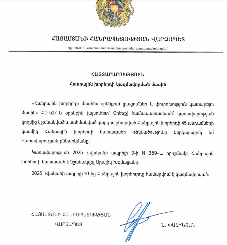 «Կառավարության 2025 թվականի ապրիլի 9-ի N 389-Ա որոշմամբ Հանրային խորհրդի նախագահ է նշանակվել Արայիկ Խզմալյանը։ 2025 թվականի ապրիլի 10-ից Հանրային խորհուրդը համարվում է կազմավորված»,- ասված է վարչապետի հայտարարության մեջ։