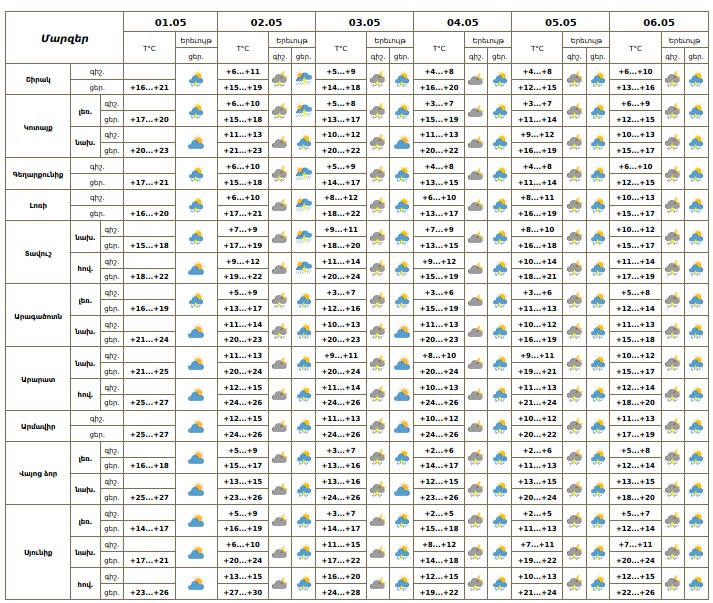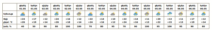 Հանրապետության տարածքում մայիսի 2-4-ի գիշերը, 3-ին առանձին շրջաններում, 2-ի և 4-ի ցերեկը, 5-6-ին շրջանների զգալի մասում սպասվում է կարճատև անձրև և ամպրոպ, 2-ի ցերեկն առանձին վայրերում՝ հորդառատ։ Քամին՝ հարավարևմտյան՝ 2-5 մ/վ, ամպրոպի ժամանակ սպասվում է քամու ուժգնացում՝ 18-22 մ/վ արագությամբ։