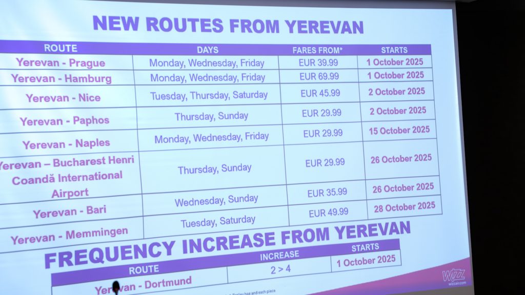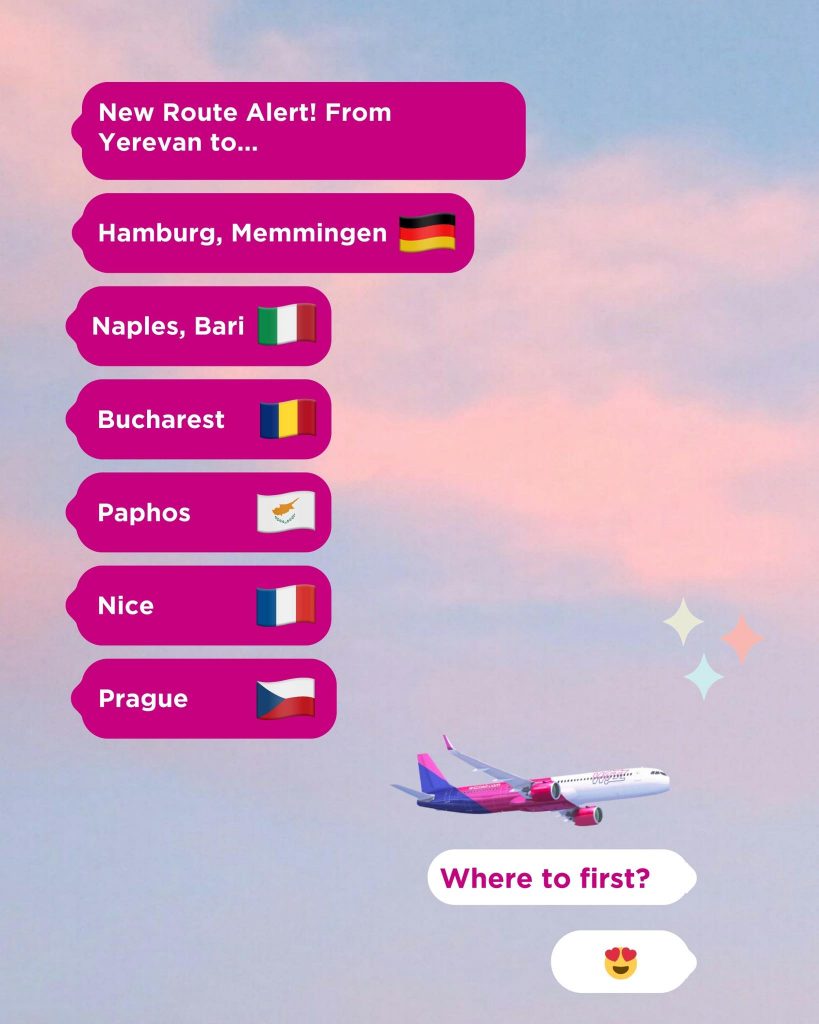 Երթուղային ցանցի ընդլայնման շնորհիվ Wizz Air-ը կբարելավի Հայաստանի և Եվրոպայի միջև օդային կապի հասանելիությունը՝ առաջարկելով ավելի շատ չվերթներ գրավիչ գներով։ 2025 թվականի հոկտեմբերից սկսած՝ ուղևորները կարող են վայելել նոր ուղիղ չվերթների հարմարավետությունը՝ Երևանի և Բարիի, Բուխարեստի, Համբուրգի, Նեապոլի, Նիցցայի, Մեմինգենի, Պաֆոսի և Պրահայի միջև։ Միակողմանի տոմսի գինը ներառում է վարչական վճար և ձեռքի փոքր ուղեբեռ (առավելագույն չափսեր՝ 40x30x20 սմ): Անվավոր ճամպրուկների և գրանցված ուղեբեռի այլ տեսակների համար գանձվում է լրացուցիչ վճար։ Գինը գործում է միայն wizzair.com կայքում և WIZZ բջջային հավելվածի միջոցով ամրագրման դեպքում։ Նշված գներով տեղերի քանակը սահմանափակ է։