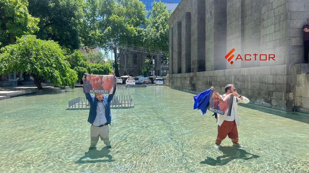 Ոստիկանները ցուցարարներին տեղափոխեցին դիմացի մայթ։ Երկու մասնակիցներ մտան ջրավազանն ու ցուցապաստառներ պարզեցին։
