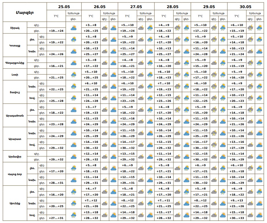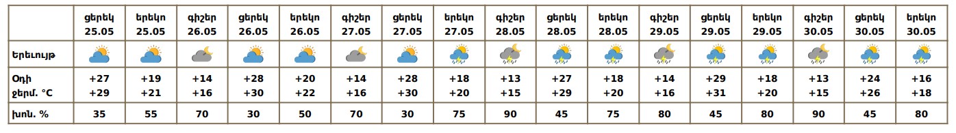 Հանրապետության տարածքում՝ մայիսի 25-ի ցերեկը, 27-ին կեսօրից հետո, 28-30-ին գիշերը և կեսօրից հետո առանձին շրջաններում սպասվում է կարճատև անձրև և ամպրոպ, առանձին հատվածներում սպասվում է նաև կարկուտ։