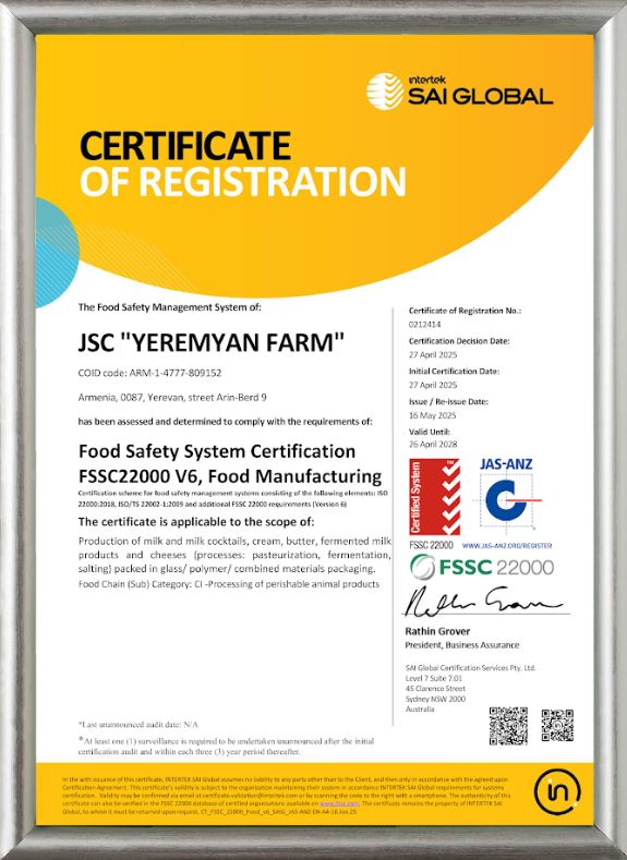 Հայաստանում «Սերմից՝ սեղան» եզակի հայեցակարգով արտադրվող կաթնամթերքի Երեմյան բրենդն աշխարհում հեղինակավոր Intertek SAI Global ավստրալիական աուդիտորական ընկերության կողմից վերջերս անցել է կաթնամթերքի արտադրության խստագույն ստանդարտ համարվող FSSC 22000 V 6 սերտիֆիկացիոն աուդիտը և ստացել FSSC 22000 (Food Safety System Certification) սերտիֆիկատ։ Երեմյան կաթնամթերքը ոլորտում այս սերտիֆիկատով առաջինն ու միակն է։