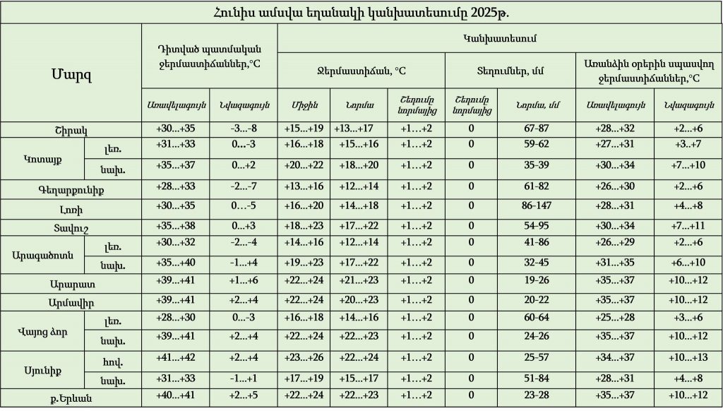 Հունիսին օդի ամսական միջին ջերմաստիճանը կանխատեսվում է նորմայից բարձր՝ 1-2 աստիճանով