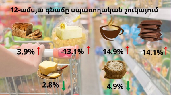 Այսպիսով՝ հացի գինը նախորդ տարվա մայիսի համեմատ աճել է 3.9%-ով,  կարագինը՝ 13.1%-ով, սուրճինը՝ 14.9%-ով, շոկոլադինը՝ 14.1%-ով։