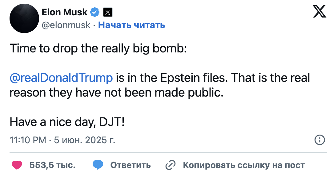 «Իսկական ռումբ գցելու ժամանակը. Թրամփը Էփշտեյնի ֆայլերում է»։ Ահա թե ինչու դրանք իրականում չեն հրապարակվի»,- գրել է Մասկը։