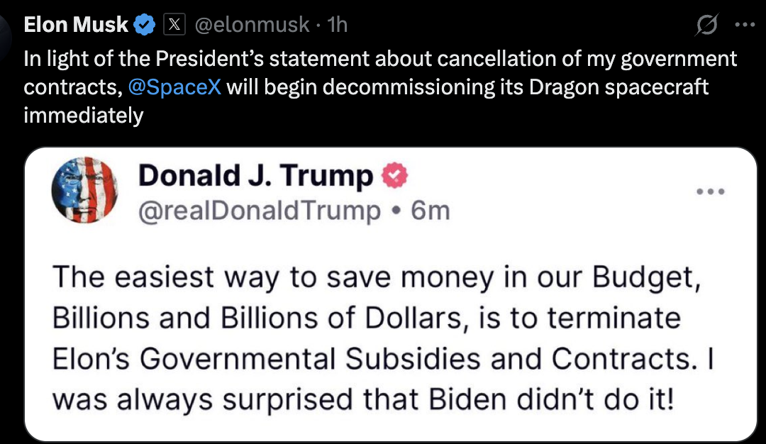 «Հաշվի առնելով նախագահի հայտարարությունը իմ պետական պայմանագրերը չեղյալ հայտարարելու մասին, SpaceX– ը անմիջապես կսկսի իր Dragon տիեզերանավը շահագործումից հանել», – գրել է նա: