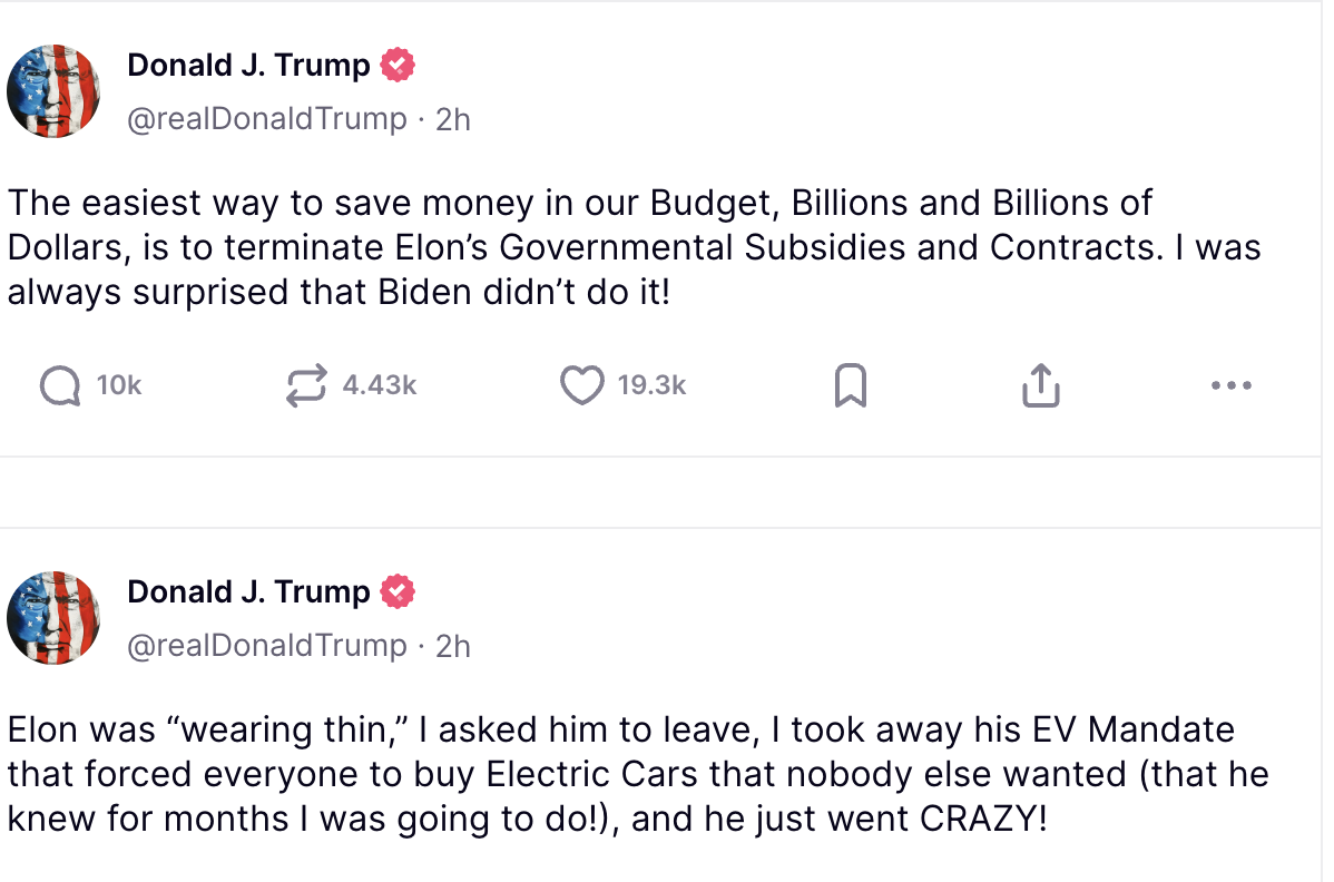 Ավելի ուշ Թրամփը սոցցանցի իր էջում արձագանքել է՝ նշելով, որ Մասկը խելագարվել է. «Ես նրան խնդրեցի հեռանալ, ես չեղարկեցի նրա Էլեկտրական մեքենաների մանդատը, որը բոլորին ստիպում էր գնել էլեկտրական մեքենաներ, որոնք ոչ ոքի պետք չեն։ Նա խելագարվեց»,- գրել է ԱՄՆ նախագահը։