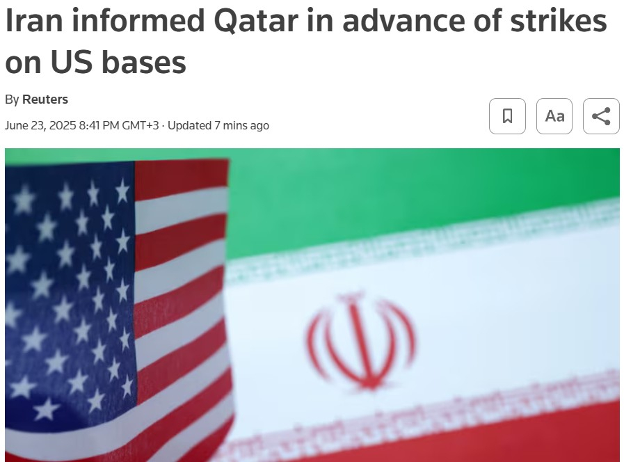 Reuters լրատվական գործակալությունը, հղում անելով իր աղբյուրներին, հայտնում է, որ Իրանն ԱՄՆ-ին երկու դիվանագիտական խողովակներով տեղեկացրել է Կատարի օբյեկտներին հարվածելուց մի քանի ժամ առաջ, փոխանցում է BBC-ի ռուսական ծառայությունը։