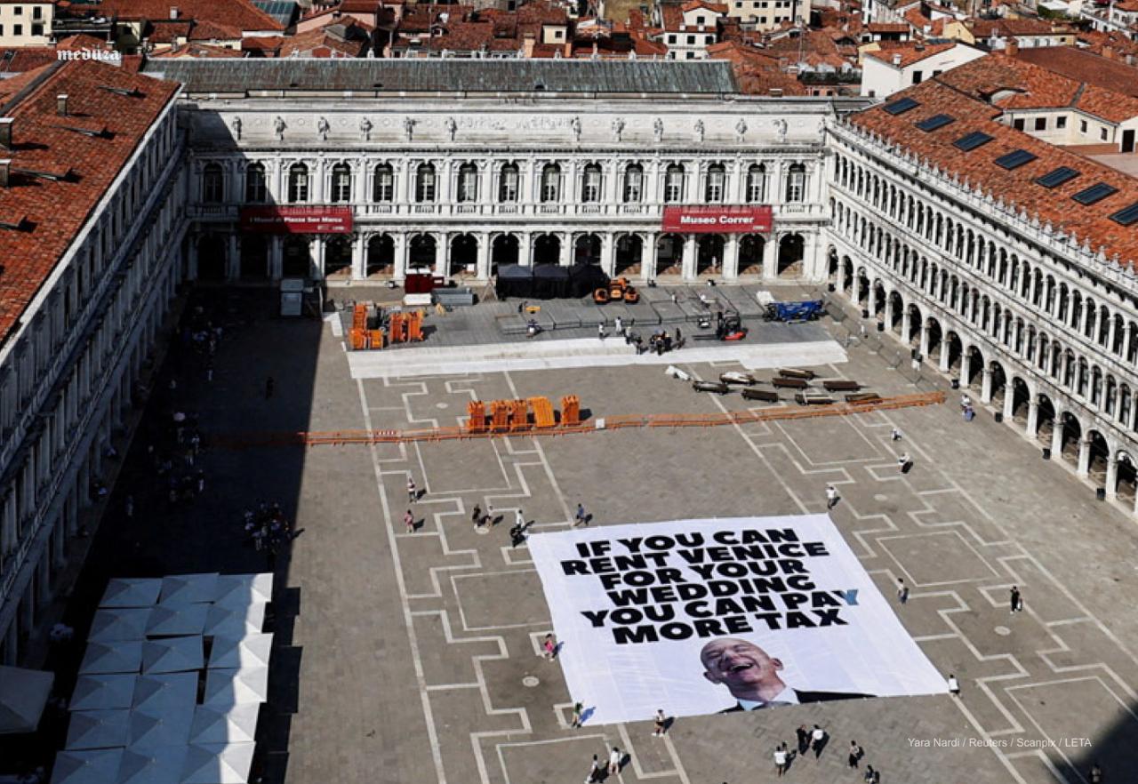 Նրանք փոքր բողոքի ակցիաներ են անցկացրել՝ Բեզոսի դեմ պաստառներ պարզելով Վենետիկի խորհրդանշական տեսարժան վայրերում։ Ակտիվիստները մտահոգություն են հայտնել Amazon-ի աշխատանքային քաղաքականության, Բեզոսի և եվրոպական կառավարությունների միջև շարունակվող հարկային վեճերի, ինչպես նաև նրա քաղաքական կապերի վերաբերյալ։