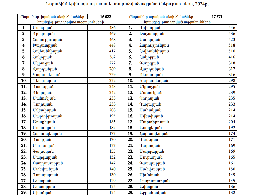 ՀՀ վիճակագրական կոմիտեի տվյալների համաձայն՝ 2024 թվականին ծնված երեխաների շրջանում ամենատարածված ազգանունները եղել են Սարգսյան և Գրիգորյան։