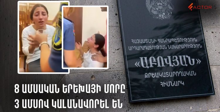 Երևանի ընդհանուր իրավասության դատարանի դատավոր Արշակ Մաթևոսյանն այսօր որոշում է կայացրել 3 երեխաների մորը երեք ամսով կալանավորել։ Արդեն շուրջ 4 ժամ է՝ ամբաստանյալ Լիանա Հարությունյանը դատարանի՝ կալանավորվածների համար նախատեսված վայրում է, սպասում է դատարանը որոշումը տրամադրի, որ խնամքին մնացած 8 ամսական երեխայի հետ տեղափոխվի «Աբովյան» քրեակատարողական հիմնարկ։ Հայրը նշել է, որ չի կարող երեխային պահել, … Continue reading 8 ամսական փոքրիկին մոր հետ կալանավայր են տանելու. նոր մանրամասներ աղմկահարույց դատական նիստից