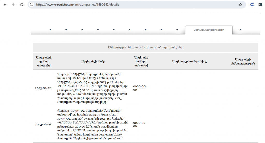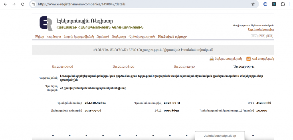Ըստ աղբյուրի՝ դեռ 2023 թվականից «Գոլդեն Ֆլորենս» ՍՊԸ-ն երկու տարբեր վարույթներով պետք է պետական բյուջե վճարեր ընդհանուր 563 հազար դրամ, ինչը չի կատարվել։