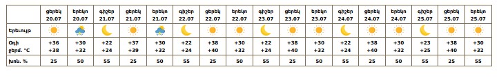 Երևանում հուլիսի 20-ի և 21-ի երեկոյան ժամերին քաղաքի առանձին հատվածներում հնարավոր է կարճատև անձրև և ամպրոպ: Հուլիսի 22-25-ին սպասվում է առանց տեղումների եղանակ։ Երեկոյան ժամերին և ամպրոպի ժամանակ սպասվում է քամու ուժգնացում 15-18մ/վ արագությամբ։