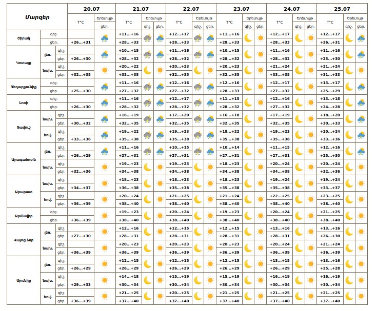 Հանրապետության տարածքում հուլիսի 20-ին կեսօրից հետո, 21-22-ին գիշերը և կեսօրից հետո, 25-ին կեսօրից հետո առանձին շրջաններում սպասվում է կարճատև անձրև և ամպրոպ, հուլիսի 20-ին առանձին հատվածներում՝ հորդառատ, հնարավոր է նաև կարկուտ։ Հուլիսի 23-24-ին սպասվում է առանց տեղումների եղանակ։ Քամին՝ արևմտյան 2-5մ/վ, ամպրոպի ժամանակ սպասվում է քամու ուժգնացում՝ 17-20մ/վ արագությամբ։