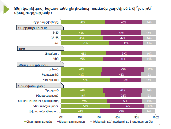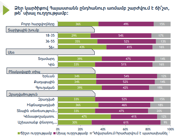 Հայաստանի քաղաքացիների գրեթե կեսը՝ 49%-ը գտնում է, որ Հայաստանը ընդհանուր առմամբ գնում է սխալ ուղղությամբ, 36%-ը նշել է ճիշտ ուղղությամբ պատասխանը, իսկ 15%-ը դժվարացել, կամ հրաժարվել է պատասխանել։ Այս տվյալներն ամփոփված են ՀՀ-ում իրականացված հանրային կարծիքի ուսումնասիրության մեջ։ Հետազոտությունն իրականացվել է Միջազգային հանրապետական ինստիտուտի (ՄՀԻ) Հարցումների հետազոտությանկենտրոնի նախաձեռնությամբ՝ Center for Insights in Survey Research, և իրականացվել ԲՐԵՎԻՍ ընկերության կողմից (ներկայացված է IPSC LLC-ի կողմից)։