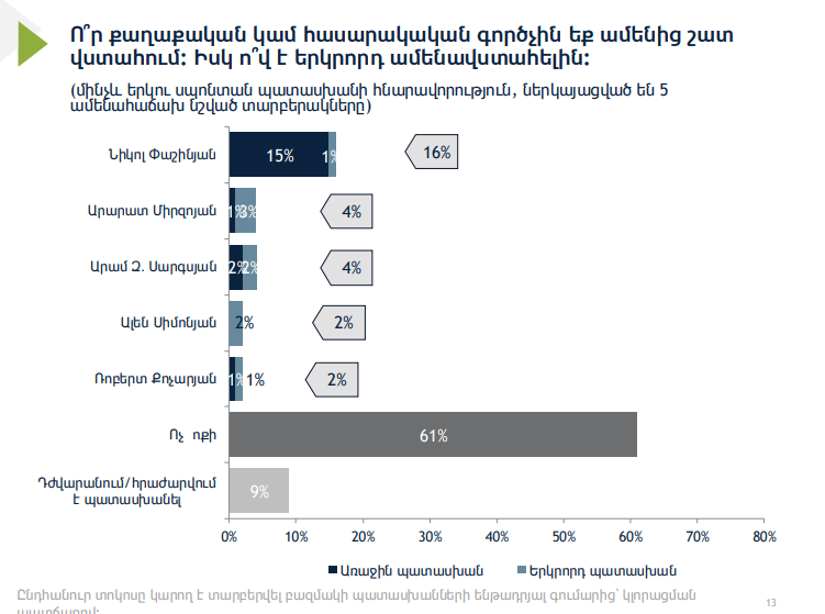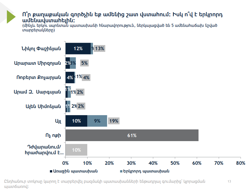 ՀՀ քաղաքացիների 13%-ը ամենից շատ վստահում է Նիկոլ Փաշինյանին, 4%-ը՝ Ռոբերտ Քոչարյանին։ Տվյալներն ամփոփված են Հայաստանում անցկացված սոցհարցման մեջ։ Հետազոտությունն իրականացվել է Միջազգային հանրապետական ինստիտուտի նախաձեռնությամբ։
