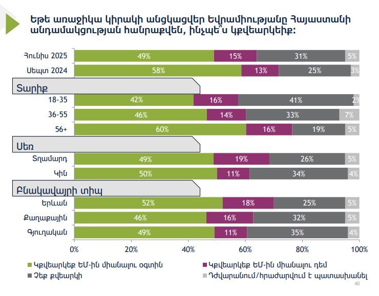 Եթե առաջիկա կիրակի ԵՄ անդամակցության հանրաքվե անցկացվեր՝ կողմ կքվեարկեր հայաստանցիների 49%-ը, դեմ՝ 15%-ը։ Քվեարկությանը ընդհանրապես չէր մասնակցի հարցվածների 31%-ը։ Տվյալներն ամփոփված են Հայաստանում անցկացված սոցհարցման մեջ։ Հետազոտությունն իրականացվել է Միջազգային հանրապետական ինստիտուտի նախաձեռնությամբ։