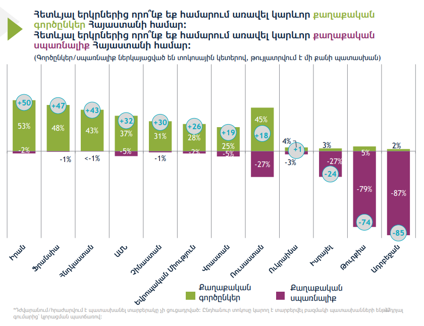 Հարցմանն անդրադարձ է եղել նաև Հայաստանի արտաքին գործընկերներին։ Հարցվածների կեսից ավելին՝ 53%-ը Հայաստանի համար քաղաքական գործընկեր է համարում Իրանին։ Ապա հաջորդում է Ֆրանսիան՝ 48% և Հնդկաստանը՝ 43%։ Ռուսաստանին ՀՀ-ի քաղաքական գործընկեր համարում է ՀՀ քաղաքացիների 45% , իսկ 27 % այդ երկիրը համարում է քաղաքական սպառնալիք։ Հայաստանի հետ ամենավատ հարաբերություններ ունեցող պետությունների եռյակն, ըստ IRI-ի, Ադրբեջանն է, Թուրքիան և Իսրայելը։