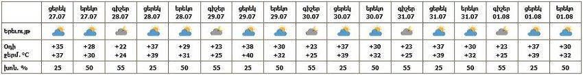 Երևան քաղաքում հուլիսի 27-ի ցերեկը, 28-29-ը և օգոստոսի 1-ին սպասվում է առանց տեղումների եղանակ։ Երեկոյան ժամերին սպասվում է քամու ուժգնացում 16-19 մ/վ արագությամբ։ Օդի ջերմաստիճանը, հուլիսի 27-ի ցերեկը, 28-29-ը աստիճանաբար կբարձրանա։
