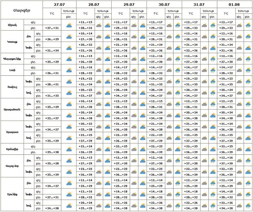 Հանրապետության տարածքում հուլիսի 27-ի ցերեկը, 28-29-ը սպասվում է առանց տեղումների եղանակ։ Հուլիսի 30-31-ը և օգոստոսի 1-ին կեսօրից հետո առանձին շրջաններում սպասվում է կարճատև անձրև և ամպրոպ, հնարավոր է նաև կարկուտ։