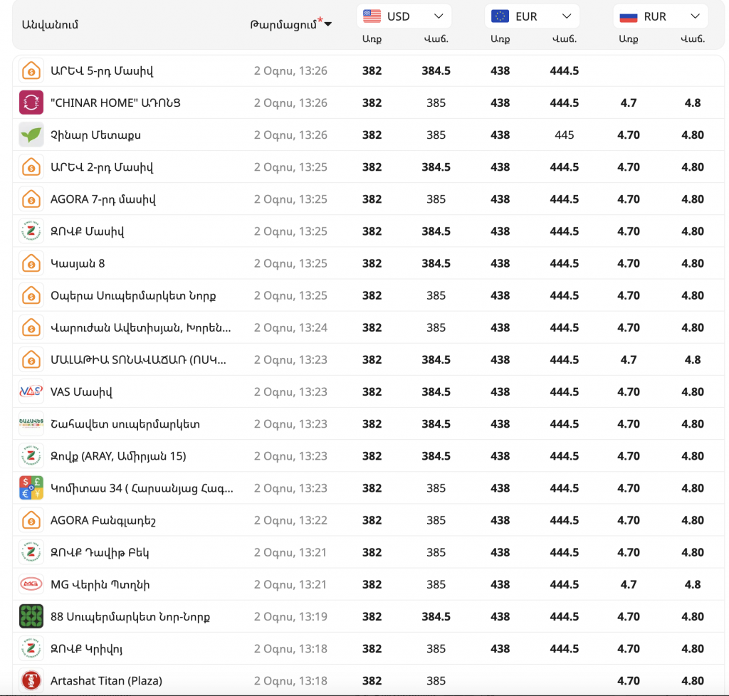 Ներկայացնում ենք Հայաստանի բանկերի կողմից գնվող և վաճառվող արտարժույթների փոխարժեքները օգոստոսի 2-ի դրությամբ՝ ըստ rate.am-ի:
